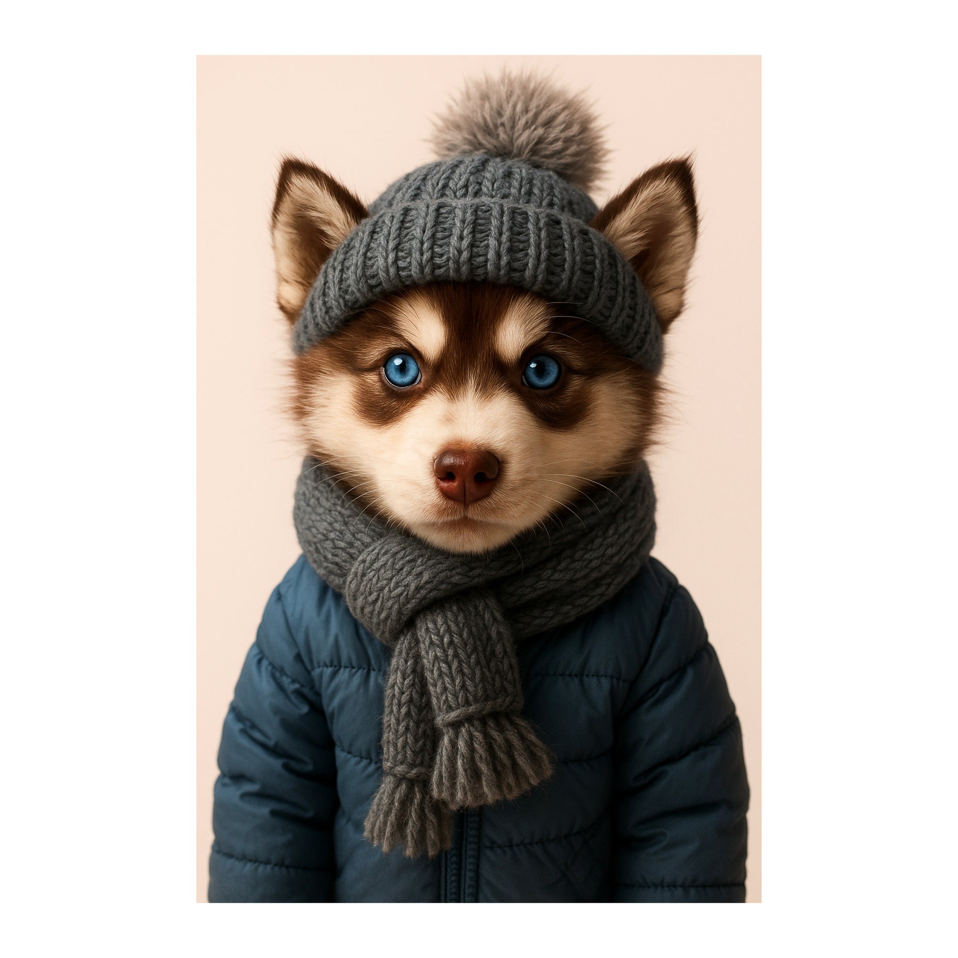 Apportez une note attendrissante et originale à votre décoration avec cette affiche unique représentant un chiot husky aux yeux bleus perçants, vêtu d’un bonnet en maille et d’une écharpe assortie, prêt à affronter l’hiver avec style. Ce visuel capture à la perfection l’alliance entre douceur animale et élégance hivernale, pour un rendu aussi chaleureux que raffiné.